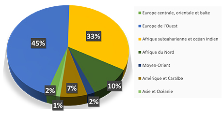Le français est, totalement ou pour partie, la langue maternelle dans cinq pays européens: la France, la Belgique, la Suisse, le Luxembourg et Monaco - soit environ 75millions de personnes. Les dix pays où l'on trouve le plus de francophones sont la France (66 millions), la République démocratique du Congo (24,3), l'Algérie (16, non membre de l'OIF), la Côte d'Ivoire (12,7), le Canada (11,5), le Maroc (10,1), le Cameroun (7,3), la Tunisie (6,3), la Belgique (6,3) et la Roumanie (6). Le continent africain détient le nombre le plus important de francophones avec un taux de 10% par rapport à sa population globale, soit 32 millions de francophones réels et 47 millions de francophones partiels.